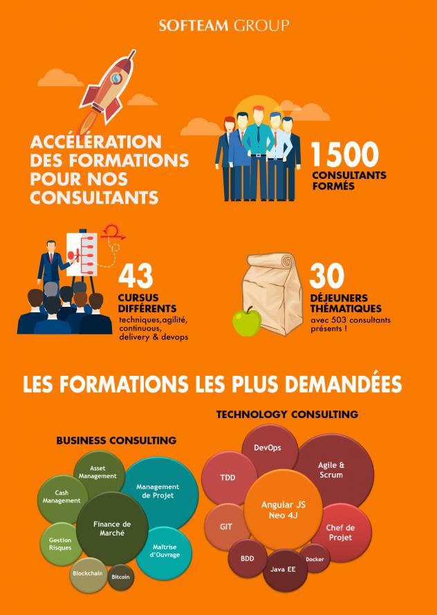 Cela s’est traduit par la réalisation de plus de 1500 formations en 2016 qui ont été dispensées aux collaborateurs via les départements Technology Consulting et Business Consulting de SOFTEAM qui regroupent respectivement 500 et 250 consultants. Sans compter les nombreux séminaires et conférences thématiques qui ont rassemblé en outre un très grand nombre de consultants en déjeuner ou en soirée. Ceci représente un investissement de 4 500 jours de formation en 2016.