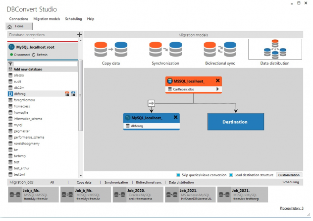 L'interface utilisateur de DBConvert Studio a été améliorée pour la rendre claire et pratique. Elle guide l'utilisateur à travers plusieurs étapes, de la configuration des connexions de base de données aux étapes de configuration flexibles jusqu'à la migration ou la synchronisation de la base de données. Une tâche enregistrée peut être planifiée pour s'exécuter plusieurs fois, il n'est donc pas nécessaire de la configurer à chaque fois.