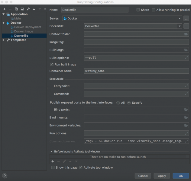 L'intégration de Docker a été améliorée. Il est désormais possible de spécifier des options CLI pour la partie construction, au moyen d'un nouveau champ dédié dans la configuration du ficher Docker : Build options.