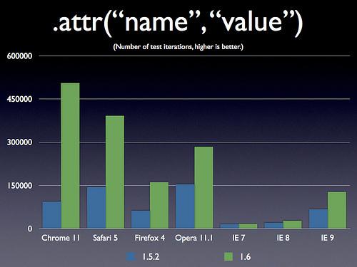 Ensuite, l'équipe du projet de jQuery s'est focalisé sur les performances. Les résultats sont excellents, pour une librairie qui est déjà bien connue pour briller en ce domaine. Avec la version 1.6, certains temps d'exécution ont été divisés par trois.