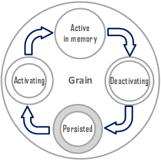 Les grains peuvent avoir un état volatil et / ou persistant qui peut être stocké dans n'importe quel système de stockage. En tant que tel, les grains partitionnent implicitement l'état de l'application, ce qui permet une évolutivité automatique et simplifie la récupération en cas de panne. L'état du grain est conservé en mémoire pendant que le grain est actif, ce qui réduit la latence et la charge sur les magasins de données.