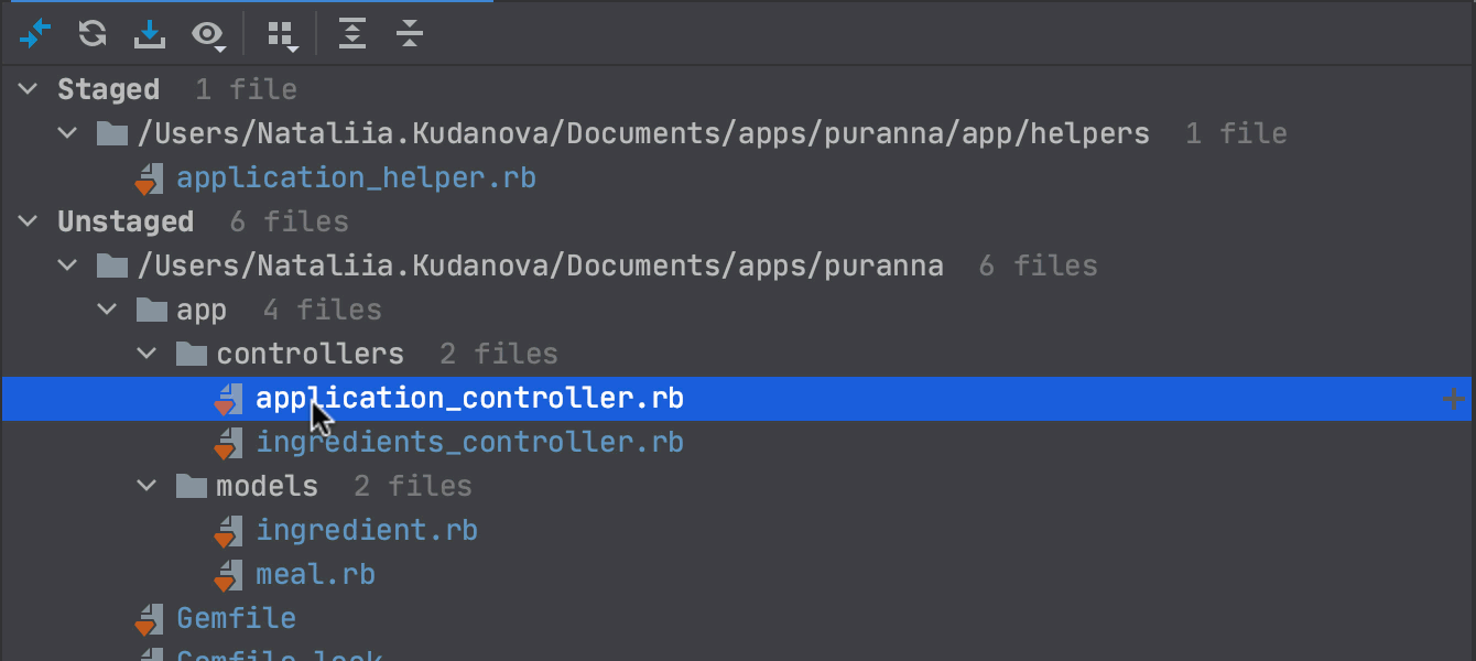 Du côté de Git, RubyMine prend désormais en charge le staging des modifications directement dans l'IDE. Vous pouvez ajouter ou retirer des fichiers à la zone de staging en cliquant sur les icônes + et - dans la vue Commit. Vous pouvez également gérer le staging depuis la gouttière ou dans la vue Diff.