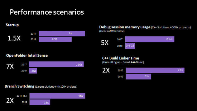 Microsoft souligne avoir beaucoup travaillé sur le performances de l'EDI et annonce une réduction spectaculaire notamment du temps de démarrage et du temps de chargement des grosses solutions.