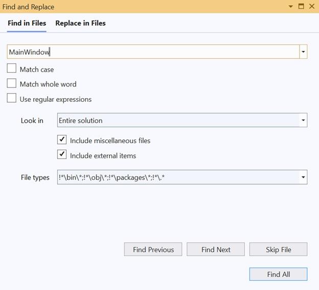 La fenêtre de l'outil 'Rechercher dans les fichiers' a été réécrite pour prendre en compte les suggestions et commentaires. Les performances ont été considérablement améliorées et les problèmes de fiabilité qui entraînaient auparavant des blocages frustrants ont été résolus, assure Microsoft qui a par ailleurs nettoyé l'interface utilisateur et ajouté quelques améliorations, telles que l'ajout d'exclusions à une requête de recherche.