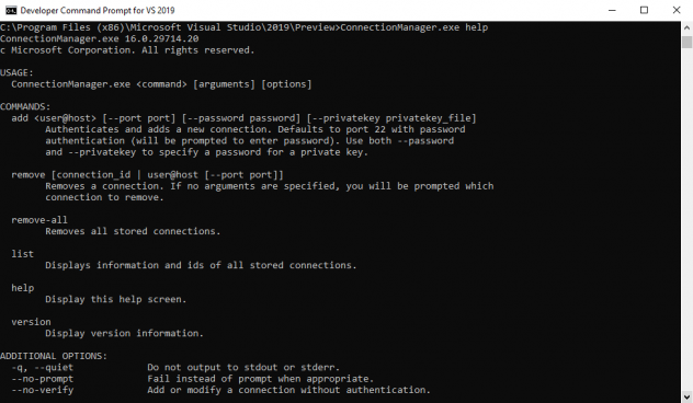 Le travail avec C++ est amélioré également. Visual Studio 2019 version 16.5 apporte plusieurs améliorations à l'expérience de développement multiplateforme C ++ et CMake. À partir de cette version, vous pouvez interagir avec vos connexions distantes stockées via la ligne de commande. Cela est utile pour des tâches telles que le provisionnement de nouvelles machines de développement ou la configuration de Visual Studio en intégration continue.