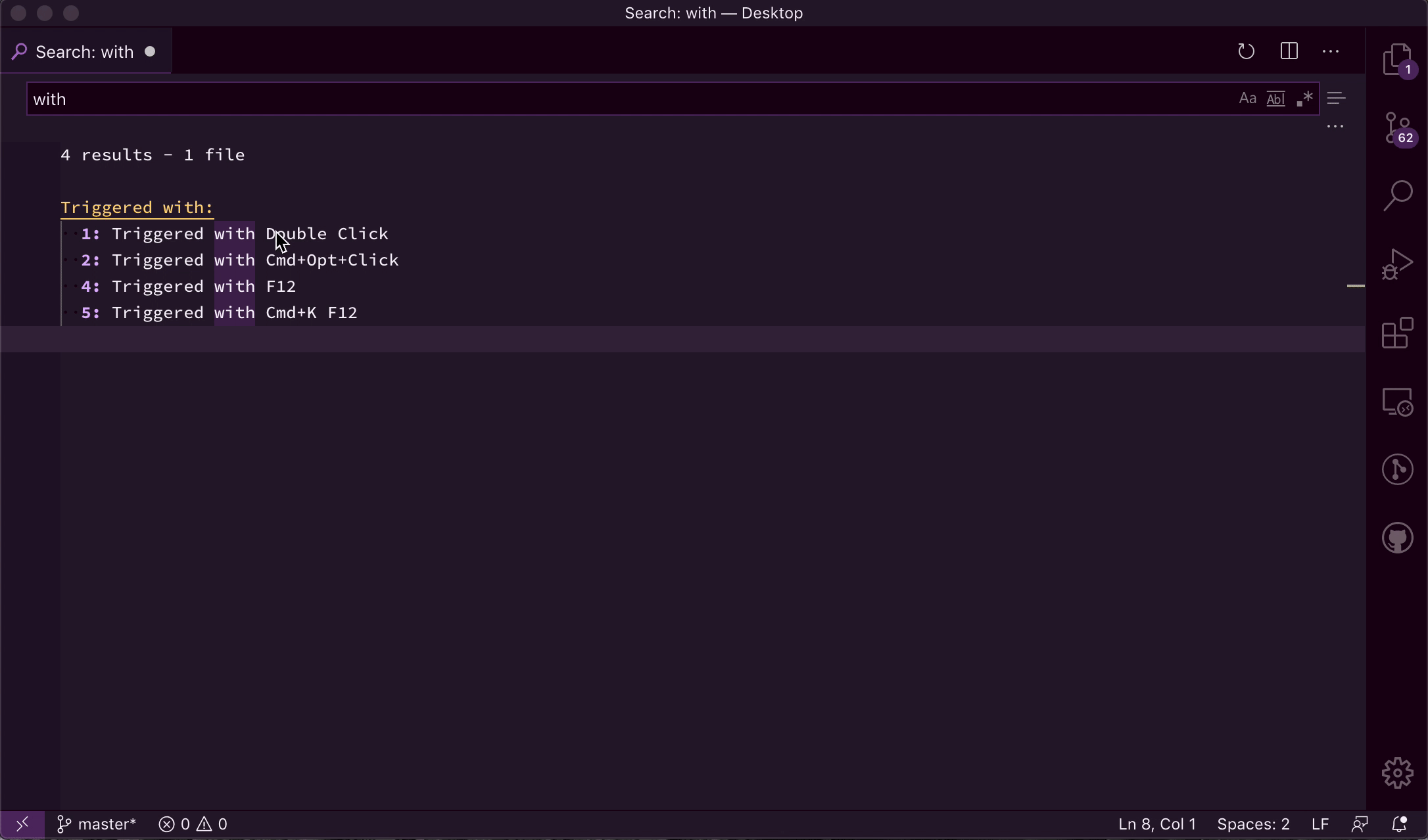 Dans un éditeur de recherche, vous pouvez accéder aux résultats à l'aide des actions Aller à la définition, telles que F12 pour ouvrir l'emplacement source dans le groupe d'éditeur actuel, ou Ctrl+K F12 pour ouvrir l'emplacement dans un éditeur sur le côté. De plus, un double clic peut éventuellement ouvrir l'emplacement source. Ce double clic est configurable avec le paramètre search.searchEditor.doubleClickBehaviour.