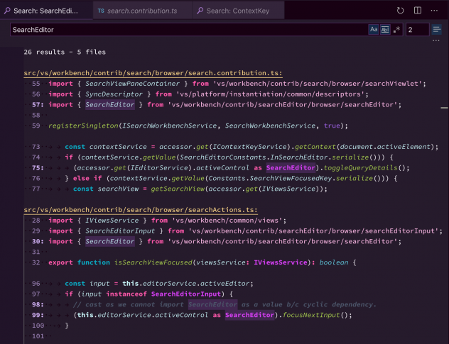 Nous remarquons notamment l'arrivée des éditeurs de recherche qui sont une fonctionnalité très demandée par les développeurs depuis quelques temps selon Microsoft. Les éditeur de recherche permettent d'afficher les résultats de la recherche dans l'espace de travail dans un éditeur de taille standard, avec mise en évidence de la syntaxe et lignes facultatives du contexte environnant. A titre d'exemple, l'illustration ci-dessous montre une recherche du mot «SearchEditor» avec deux lignes de texte avant et après la correspondance pour le contexte :