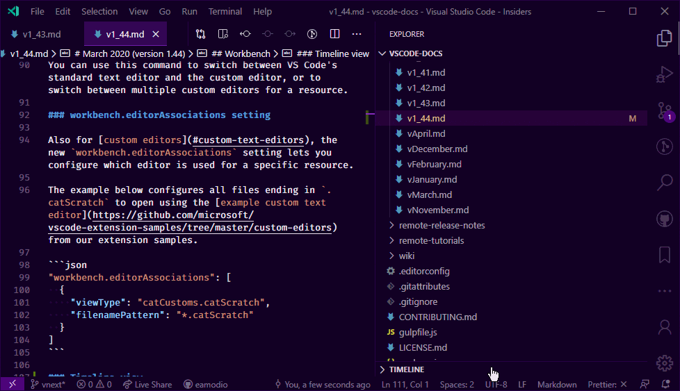 Microsoft a annoncé la sortie de Visual Studio Code 1.44, c'est à dire la version de mars de cet outil. La nouveauté la plus marquante est la sortie de la vue chronologie (Timeline view) de son statut de préversion. La vue chronologique est désormais activée par défaut.