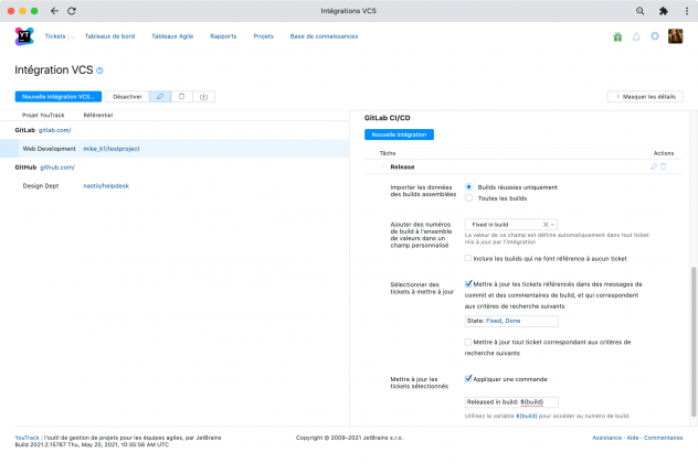 GitLab CI/CD fonctionne avec des pipelines et chaque pipeline est un ensemble de jobs. Lorsque vous validez vos modifications par commit, GitLab exécute les jobs du pipeline correspondant pour vérifier que les modifications de votre code fonctionnent comme prévu. Si le job du pipeline se termine correctement, GitLab indique à YouTrack d'actualiser ses tickets.