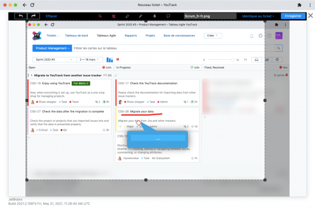 A remarquer aussi, l'arrivée d'un éditeur d'images. Un graphique peut s'avérer très utile pour expliquer un concept difficile ou résoudre un problème. C'est pourquoi YouTrack Lite et YouTrack Classic incluent désormais un éditeur d'images. Cette fonctionnalité vous permet de modifier une image et d'y ajouter des commentaires. Vous pouvez ouvrir n'importe quelle image jointe à un ticket, l'annoter avec des commentaires, recadrer une zone, dessiner par-dessus ou mettre en évidence ce qui vous semble le plus important.