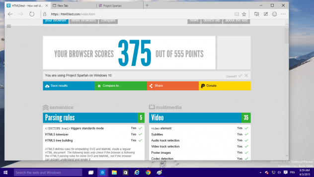 Les tests html5 (avec html5test.com) affichent un score de 375 sur 555, idem pour IE contre 516 pour Chrome 40.x et 394 pour Safari 7.1.4. Microsoft a donc encore beaucoup de travail à réaliser pour être totalement « HTML 5 compatible ».