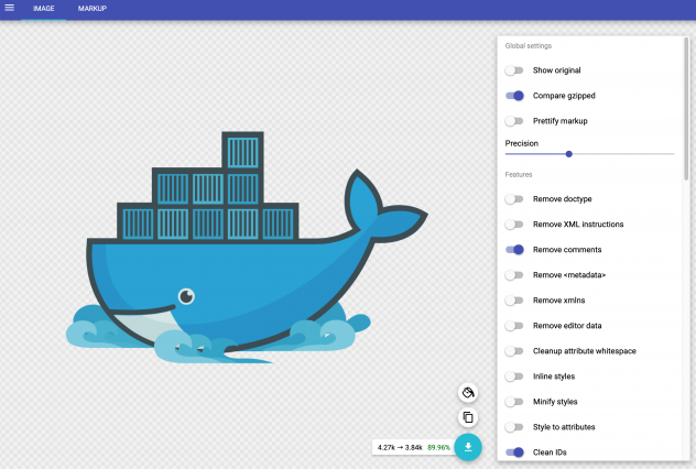 SVGOMG est un outil en ligne et gratuit. Le fonctionnement est simple : on charge un SVG et l’outil affiche les couches / options que l’on peut garder ou supprimer. A la volée, on voit les modifications et surtout le gain en ko. Selon le profil d’optimisation, on va plus ou moins gagné. Le développeur a pensé à implémenter deux modes : image et markup. Eh oui, SVG est avant tout un fichier script :-)