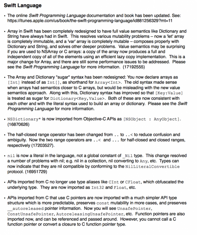 Ces modifications sont reportées dans le livre électronique gratuit proposé par Apple sur le langage Swift, et elles sont récapitulées dans une note de version.