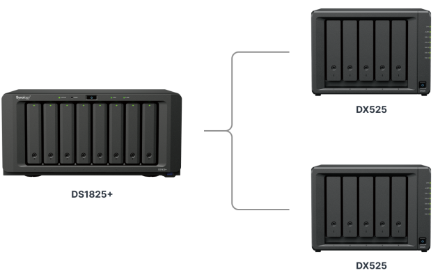 Il intègre aussi un slot PCIe 3, idéal pour une carte SPF+ 10/25 GbE. On peut installer 8 disques. Au maximum, on peut utiliser jusqu'à 18 baies via les extensions DX25. Il peut gérer une capacité totale de 360 To.
