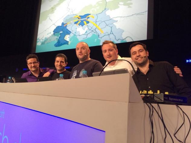 Tout commence par une longue DJ pour faire patienter les centaines de geeks et de développeurs qui attendent LA session de la journée. Sur scène, nous avons du lourd : Stan, David, Arnaud (DJ pour l’ambiance), Laurent, Sébastien.