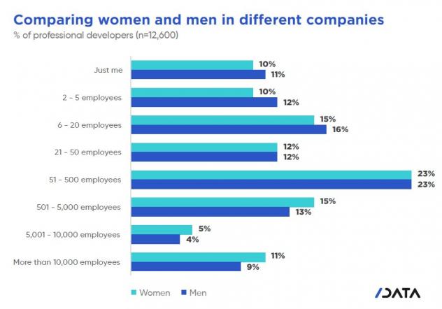 A remarquer, cette enquête s'intéresse à la présence des femmes dans le monde du développement. Celles-ci sont de plus en plus présentes :-) Mais étrangement, d'autant plus présentes que les entreprises sont importantes en taille.
