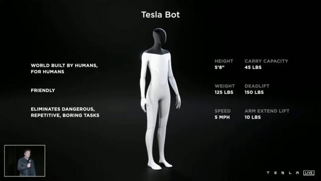Le Tesla Bot mesure 1,73 mètre pour 56,7 kilogrammes et une capacité à porter 20 kg. Il pourra soulever une charge de 68 kilogrammes ou 4,5 kg à bout de bras. Il a 5 doigts aux mains.