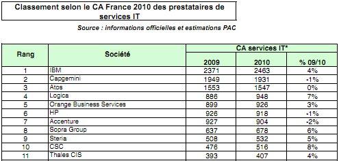 Sans surprise, les grands du secteur restent en tête du classement, bien qu’avec des dynamiques différentes suivant le repositionnement stratégique de chacun et ses conséquences en France. Des sociétés comme Logica, Sopra et Steria ont ainsi entamé un travail de réflexion sur leurs offres qui porte ses fruits en 2010. Capgemini et Atos sont en phase de redéploiement, notamment Atos qui doit gérer l’intégration de Siemens IT Services.