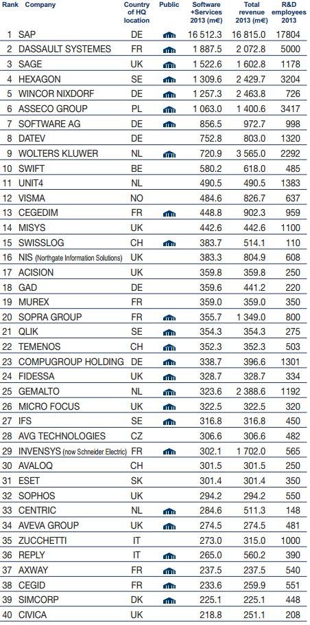 Le « Truffle 100 Europe » souligne une chute de la croissance (+2,7% en 2013 contre +11% en 2012). Les dix premiers du classement restent inchangés : SAP reste en tête suivi de Dassault Systems en deuxième position et de Sage à la troisième position. Hexagon reste à la 4ème position, suivi de Wincor Nixdorf (5ème), Asseco Group (6ème), Software AG (7ème), Datev (8ème), Wolters Kluwer (9ème) et Swift à la dixième place.