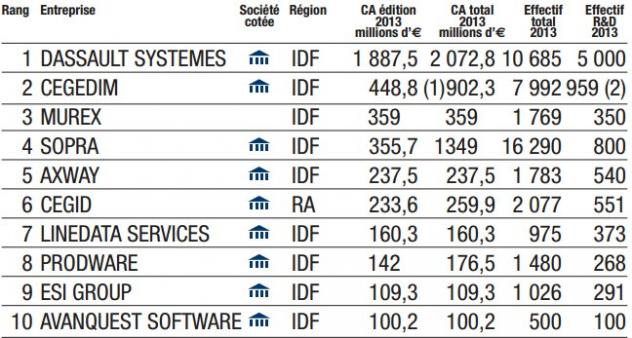 Le chiffre d'affaires Edition évolue favorablement, passant de 6,2 milliards d'euros en 2013 à 6,6 milliards d'euros en 2014. Le marché français de l'édition de logiciels reste toujours autant concentré : les 5 premiers éditeurs représentent en effet 55% de ce chiffre d'affaires. DASSAULT, leader du classement, totalise 30,3% du chiffre d'affaires.