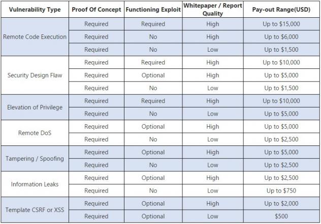 Les montants des primes s'échelonnent de 500 à 15 000 dollars. Les failles les moins bien rémunérées sont les vulnérabilités en Cross-Site-Scripting (ou XSS), les mieux rémunérées, sont, tout à fait classiquement, celles qui permettent une exécution à distance.