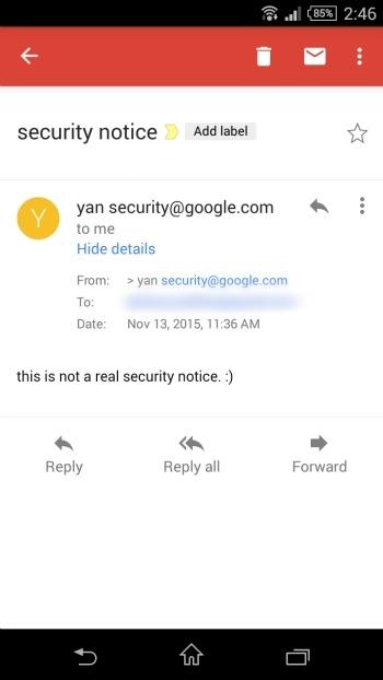 Motherboard rapporte une découverte de la chercheuse chinoise en sécurité Yan Zhu. Un bug dans Gmail pour Android (et seulement pour Android) permet de très simplement usurper l'identité de l'expéditeur des messages.