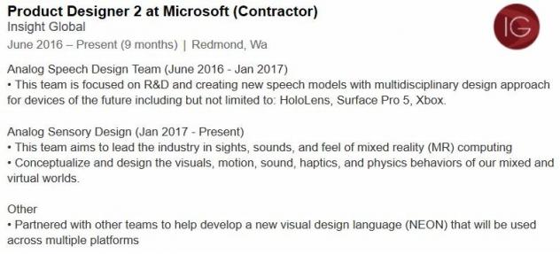Toby Fitch, sur son profil, a écrit travailler sur Surface Pro 5, à priori une nouvelle tablette, et sur le projet Neon, qui est l'interface utilisateur retravaillée de Windows 10, qui devrait venir avec la prochaine mise à jour suivant Windows Creators Update.