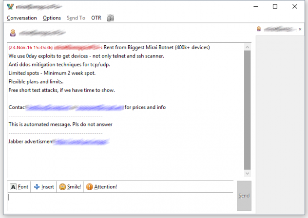 Il y a quelques temps deux pirates affirmaient posséder un botnet Mirai constitué de 400 000 (voire 500 000) zombies et le louaient sur le Dark Web, notamment sur le site TheRealDeal. Ces deux pirates ont pour pseudonymes BestBuy et Poporet.