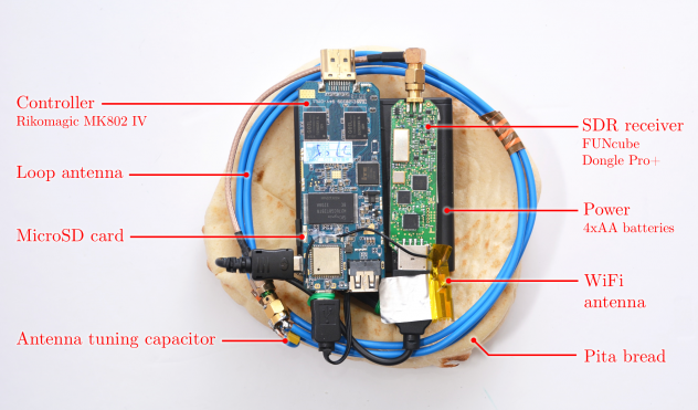 Les chercheurs affirment avoir réussi cela avec un matériel valant quelques centaines d'euros seulement, pour l'essentiel camouflé dans une pita :-) Moyennant quoi, ils ont réussi à extraire une clé de cryptage utilisée par le logiciel GnuPG après envoi d'un mail spécialement créé pour l'expérience. Ceci sans aucune action physique sur l'ordinateur attaqué.