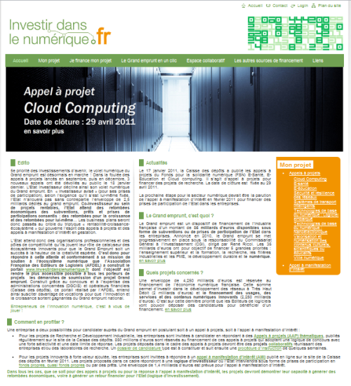 L’Association Française des Editeurs de Logiciels (AFDEL) présente un nouveau portail. portail www.investirdanslenumerique.fr dont l’objectif est rendre le plus accessible possible, à tous les porteurs de projets, les démarches de soumission d’un projet Grand emprunt, et de répondre à l'attente de l'Etat. Celui-ci souhaite que les organisations professionnelles et les pôles de compétitivité jouent leur rôle de catalyseur des écosystèmes innovants pour que le Grand Emprunt