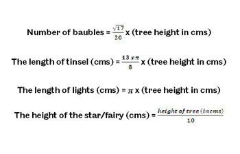 • nombre de boules de Noël = (racine carrée (17) / 20 ) x (hauteur de l'arbre en cm)