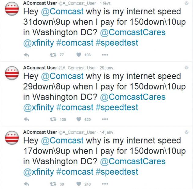 AleskeyP a donc écrit un script Python qui analyse périodiquement le débit de sa connexion. Si le script constate que le débit est faible, il poste un tweet sur un compte twitter dédié : AComcast User. Tweet à l'intention de son FAI (@Comcast) pour se rappeler à ses bon souvenirs.