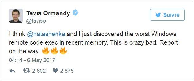 Tavis Ormandy n'est pas avare en superlatif pour qualifier la faille : le pire bug de tous, follement mauvais, la pire exécution de code à distance de Windows de ces derniers temps.
