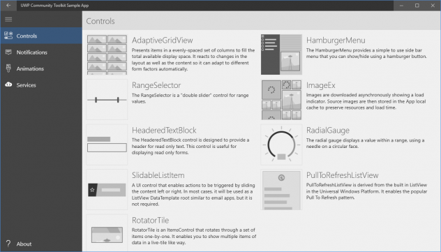 UWP oblige, tous ces composants peuvent être intégrés à des applications PC Windows 10, XBox, Windows 10 Mobile, IoT et Hololens. Parmi les composants, nous pouvons mentionner pêle-mêle des animations, une grille adaptive, un menu hamburger, des services Twitter, Facebook,...