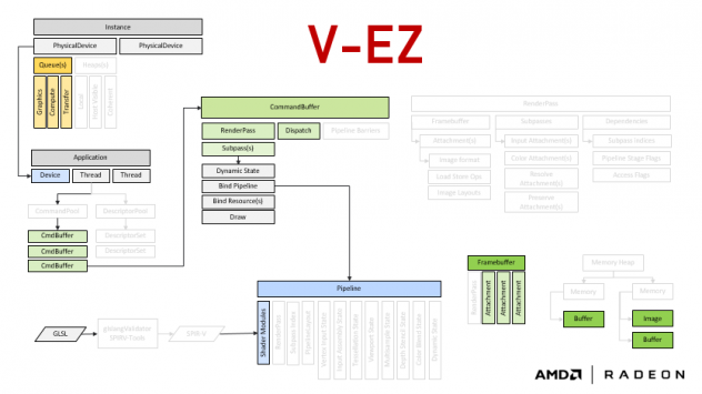 AMD apporte une solution pour cela : V-EZ. Il s'agit d'une couche d'abstraction légère (un wrapper) en C destinée à alléger la complexité de l'utilisation de l'API Vulkan. V-EZ tente de combler le fossé entre les API graphiques traditionnelles, tout en fournissant une sémantique similaire à Vulkan. V-EZ doit adoucir la prise de contact avec Vulkan :-)