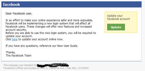 Depuis hier, une vaste campagne de phising ciblant les comptes Facebook a été lancée. Cette attaque prend la forme d'un faux message émanant de Facebook informant les internautes d'une modification du système de login pour des raisons de sécurité. En cliquant dans l'e-mail, les utilisateurs sont redirigés vers un réseau de sites malveillants.