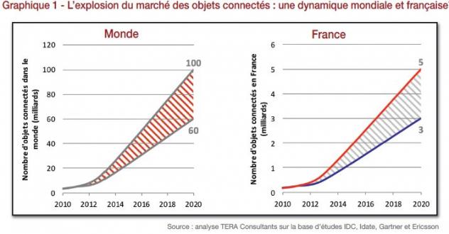 Le document publié met en avant l’importance des objets connectés dans les années à venir et estime notamment que le nombre de ces objets connectés devrait être multiplié par 50 dans les 6 prochaines années, avec une croissance particulièrement importante dans des secteurs comme la domotique et la e-santé. En France, cette explosion du marché des objets connectés donnera lieu à un volume de 500 millions giga-octets de données en transit via les réseaux mobiles. La 4G devrait jouer un rôle significatif en tant qu’ « autoroute » pour capter le trafic d’objets intégrant directement un module LTE, et pour véhiculer l’information en provenance d’autres réseaux connectés.