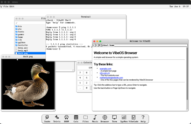 - apps livrés : navigateur, terminal, éditeur de texte, VibeCode IDE, DOOM