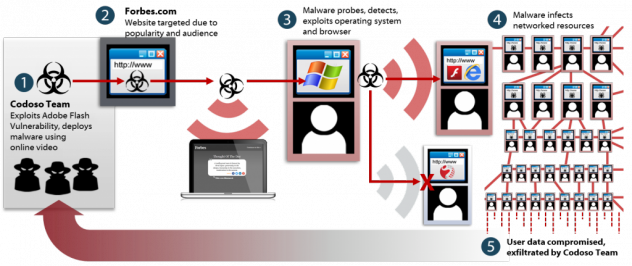 En l'occurrence, ce fut le site de Forbes qui fut sélectionné pour cela. Le widget de la 'Pensée du jour' y ayant été remplacé par un malware d'aspect identique, mais exploitant une vulnérabilité zéro day du player Flash, encore lui, conjointement à une faille d'Internet Explorer. La faille de Flash, CVE-2014-9163 est désormais patchée.