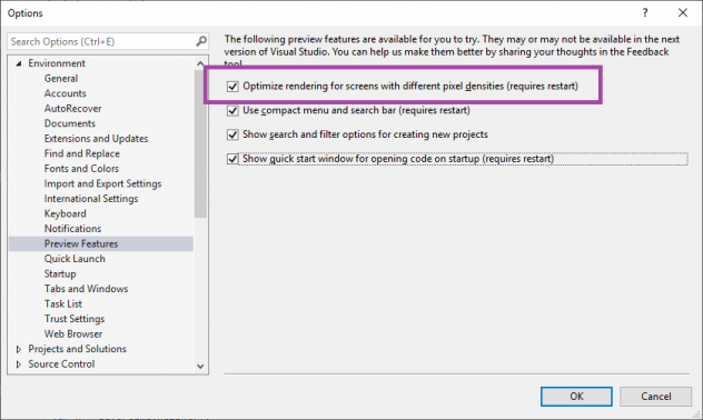 Cette nouvelle fonctionnalité PMA peut être testée à partir de Visual Studio 2019 preview 2, moyennant un Windows 10 April 2018 Update ou ultérieur ainsi que le framework .NET 4.8. Il est encore possible de la tester avec Visual Studio 2019 preview 1 à condition de l'activer explicitement, comme illustré ci-dessous.