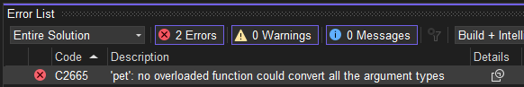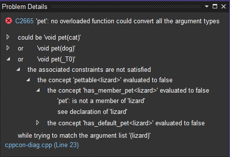 Les erreurs du compilateur C++ peuvent être longues et lourdes. Pour résoudre ce problème, nous avons créé une nouvelle fenêtre Détails du problème qui vous permet de parcourir les erreurs du compilateur de manière structurée. La fenêtre Détails du problème peut être ouverte en cliquant sur l'icône Détails d'une entrée dans la liste des erreurs.