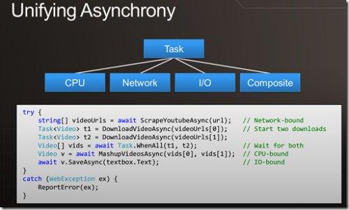 Visual Studio Async est présenté comme fournissant un modèle de programmation unifié (en C# ou VB.NET) à la fois simple et permettant d'écrire un code facile à maintenir, un modèle qui veut "révolutionner la programmation asynchrone" d'après l'éditeur.