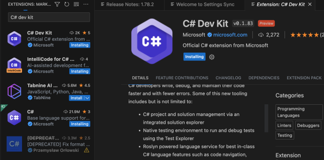 C# Dev Kit apporte à VS Code une meilleure productivité et expérience de codage C# plus proche de celle que nous connaissons sur Visual Studio. Ainsi, on pourra plus facilement explorer les projets C#, éditer rapidement les fichiers, le mode debug sur le backend d'une API, etc. Ce Dev Kit est un ensemble d'extensions complémentaiees : C# Dev Kit Extension + C# Extension + Intellicode for C# Dev Kit.