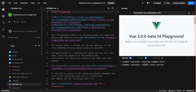 En attendant la disponibilité de Vue.js 3.0, les développeurs peuvent essayer la version bêta dans un bac-à-sable, un terrain de jeux, mis en ligne par l'équipe du projet. Cette sandbox propose un projet complet dans Visual Studio Code.
