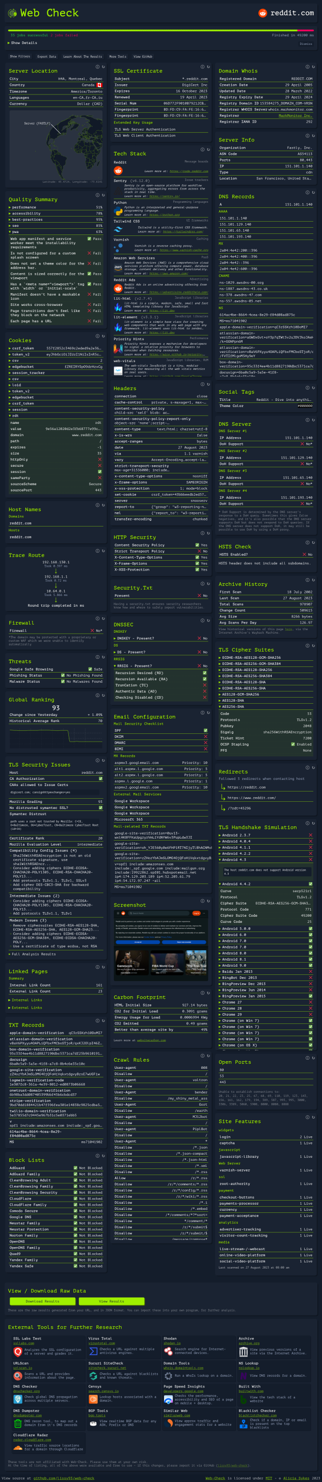 Web Check est un outil open source qui va analyser un site web et donner des informations sur la surface d'attaque potentielle, donner des informations sur le serveur, les technologies utilisées et la configuration de sécurité.