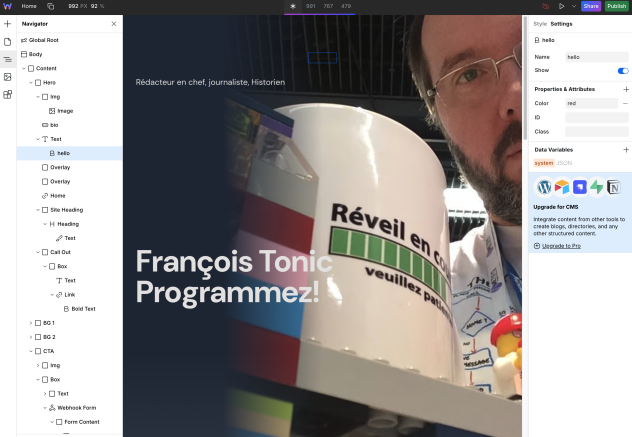 Webstudio est une plateforme de création de pages et de sites web. L'outil est open source. Il se veut une alternative à Webflow. Il peut se connecter à un CMS, supporte pleinement CSS et peut être facilement hébergé chez un hébergeur ou directement sur Webstudio. Il peut vous aider à créer des sites vitrines, du e-commerce ou encore être utilisé avec un CMS. On dispose d'un vrai designer pour créer les pages.