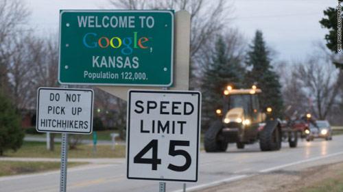 Aux Etats-Unis, état du Kansas, la ville du nom de Topeka,  par décision de sa mairie, s'appelera Google pendant tout un mois.