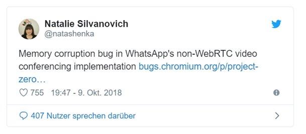 Natalie Silvanovich, chercheuse pour Project Zero de Google a découvert un bug dans WhatsApp qui permet aux pirates de compromettre l’application en passant un simple appel vidéo. Pour déclencher le bug, l’application mobile doit recevoir un paquet RTP mal conçu. Ce paquet déclenche ensuite l’erreur et fait planter l’application. D’après le rapport, les clients sont affectés sur Android comme sur iPhone, car ces deux systèmes utilisent le protocole nécessaire.