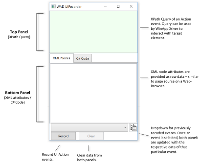 UI Recorder suit les interactions du clavier et de la souris avec une interface d'application représentant une action de l'interface utilisateur. Lorsque l'enregistrement est actif, les panneaux supérieurs et inférieurs sont mis à jour dynamiquement chaque fois qu'une nouvelle action d'interface utilisateur a lieu. Le panneau supérieur affiche la requête XPath générée pour l'élément d'interface utilisateur actuellement sélectionné, et le panneau inférieur affiche les informations XML brutes pour le même élément. Vous pouvez accéder à l'onglet Code C # dans le panneau inférieur pour afficher le code C # généré de l'action enregistrée que vous pouvez utiliser sur un test WinAppDriver.