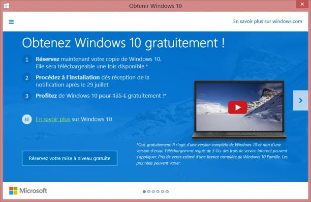 Chacun peut le vérifier sur son Windows 7 ou 8.x, en cliquant sur la petite icône symbolisant Windows, qui est apparue sur le côté droit de la barre des taches. L'application correspondante permet de réserver la mise à jour de Windows 10 à ceux qui y ont droit, et vous rappelle que ce faisant vous économisez 135 euros.